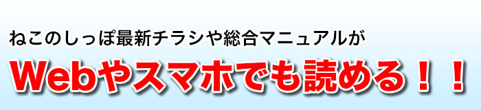 ねこのしっぽ最新チラシや総合マニュアルを、ブラウザやスマートフォン、タブレットなどでも参照できるよう、電子書籍化しました。ご覧になりたい項目をクリックすると、電子書籍のページが開きます。動作環境などの詳細は、リンク先のページをご確認ください。