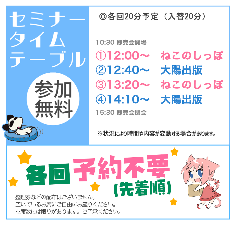 【出展内容】 ![]() 初心者向け同人誌制作セミナー &相談コーナー ![]() 同人誌印刷見本、オプション加工見本、アクリルグッズ・PUレザー製グッズのサンプルなど、見て触ってご確認いただけます。 ![]() ねこのしっぽ印刷サンプル |