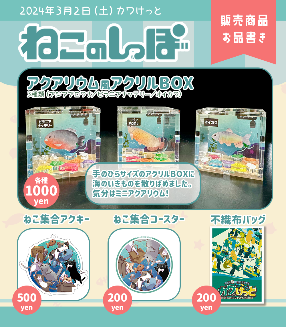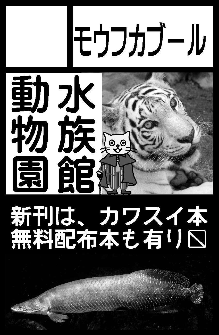 新刊は、カワスイ本「怪魚研究日誌」です。また、ピラルク、アロワナ、ピラニア、ムベンガ、ポリプテルスの缶バッヂもあります。無料配布本もあるので、もらいに来てね。