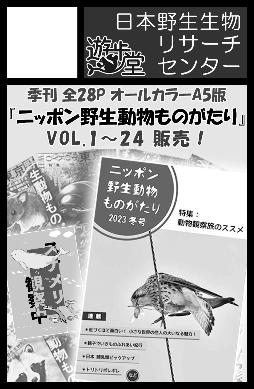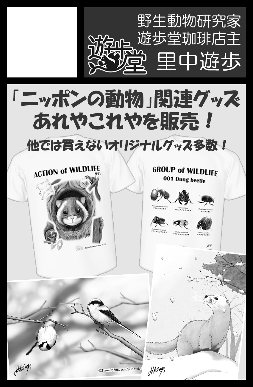 今回は、里中を始めとする調査仲間たちによって執筆されている季刊『日本野生動物ものがたり』、また遊歩堂オリジナルのグッズ販売などを中心に展開します。もちろん当日は里中遊歩本人も参加します。