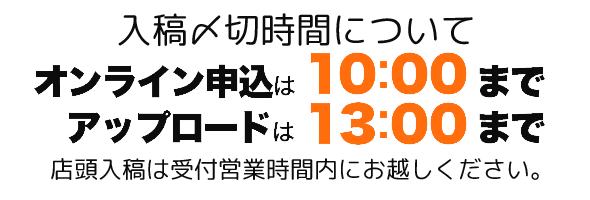 オンライン入稿は申込みが〆切当日10:00まで、原稿のアップロードが13:00までです。