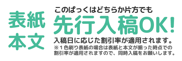 【特殊加工オプションご利用の方へ】オプションをご利用の場合は、表紙・本文ともにオプションの〆切が適用されます。その場合、通常の早期入稿割引は適用外となります。